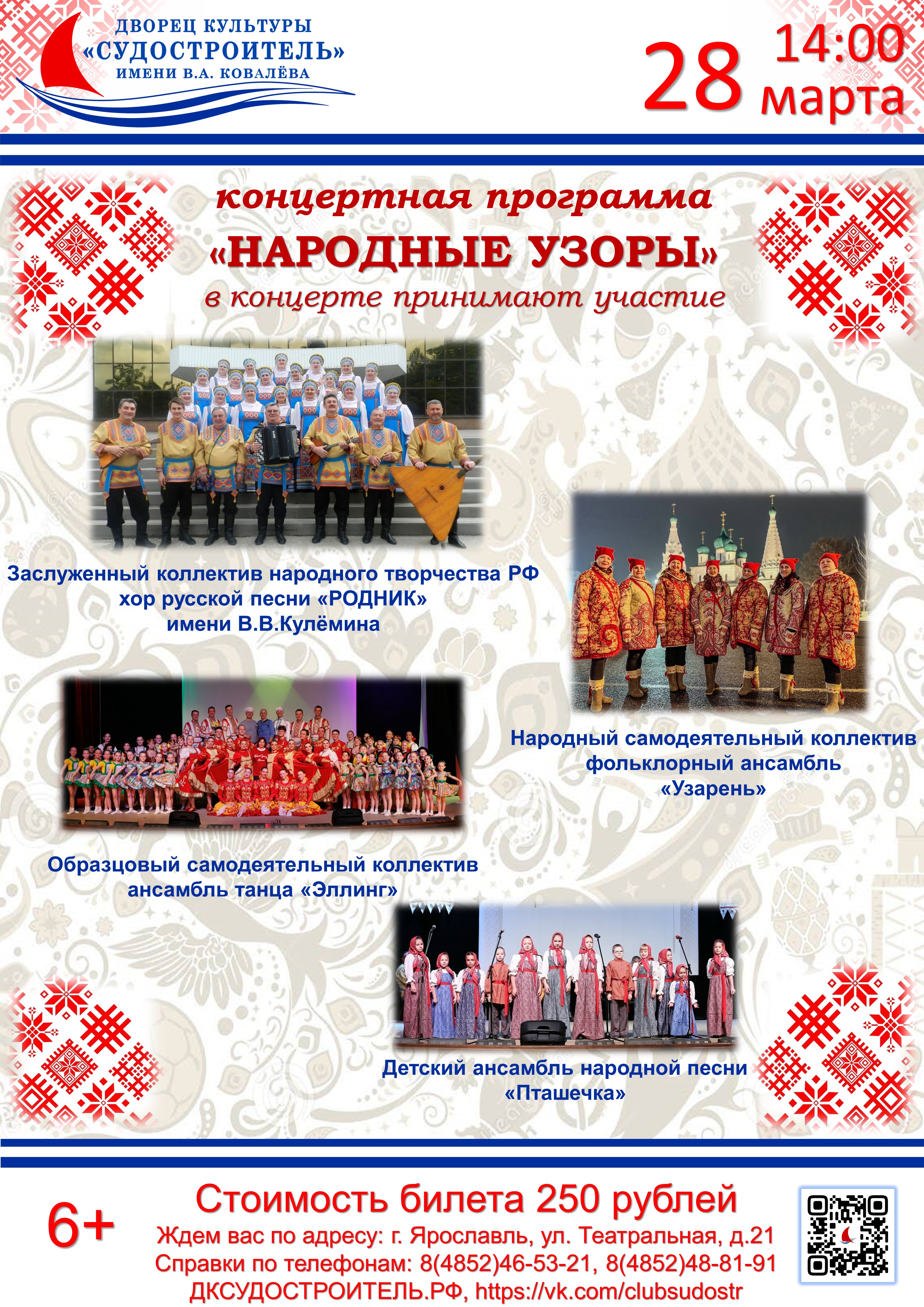 Приглашаем любителей народного творчества на совместную концертную программу самодеятельных коллективов народного направления Дворца культуры "Судостроитель» имени В.А. Ковалёва. Концерт станет прекрасной возможностью для всех присутствующих окунуться в мир народного песенного и танцевального искусства и получить заряд положительных эмоций. Билеты можно приобрести в кассе учреждения и через билетного оператора ЯрШоу yar-show.ru/events/kon...